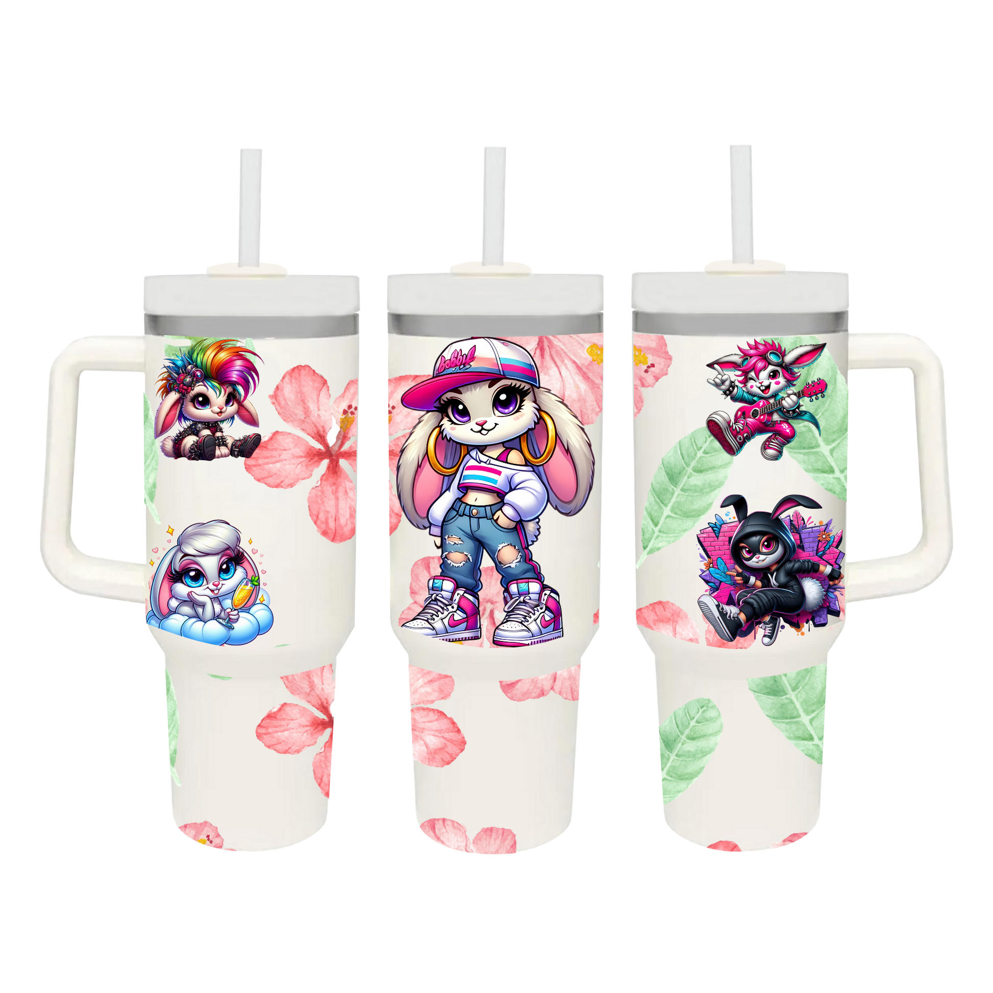 40oz insulated tumbler with plastic lid and straw. Can hold hot or cold drinks for almost all day.